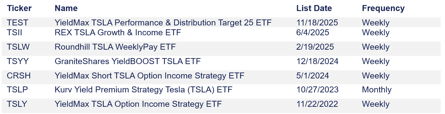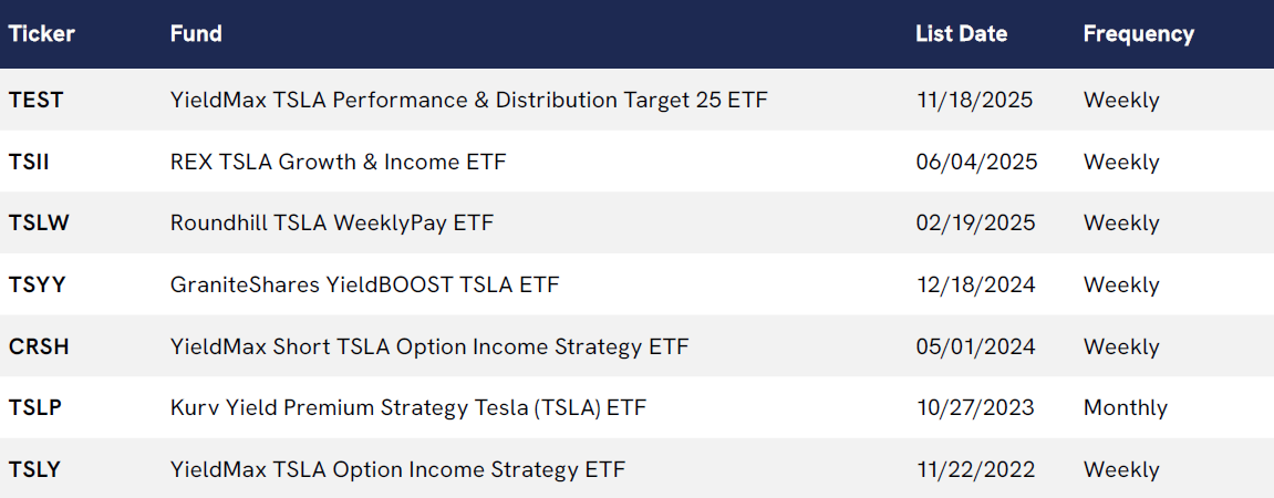 The list above points to the sheer variety of income-generating ETFs available today referencing Tesla. In 2025, Tesla was a higher-beta, mega-cap equity, but its common stock does not pay dividends. Yet, a growing handful of ETF managers are meeting investors interested in both the underlying stock and previously absent returns of capital. Tesla income ETFs alone saw 75% new product growth, compared to the number of products available at the end of 2024. Newer product launches reflect more conservative returns of capital as YieldMax debuted on Cboe with the YieldMax TSLA Performance & Distribution Target 25 ETF (TEST), joining likes of REX TSLA Growth & Income ETF (TSII), Roundhill TSLA WeeklyPay ETF (TSLW), and early entrant Kurv Yield Premium Strategy Tesla ETF (TSLP).