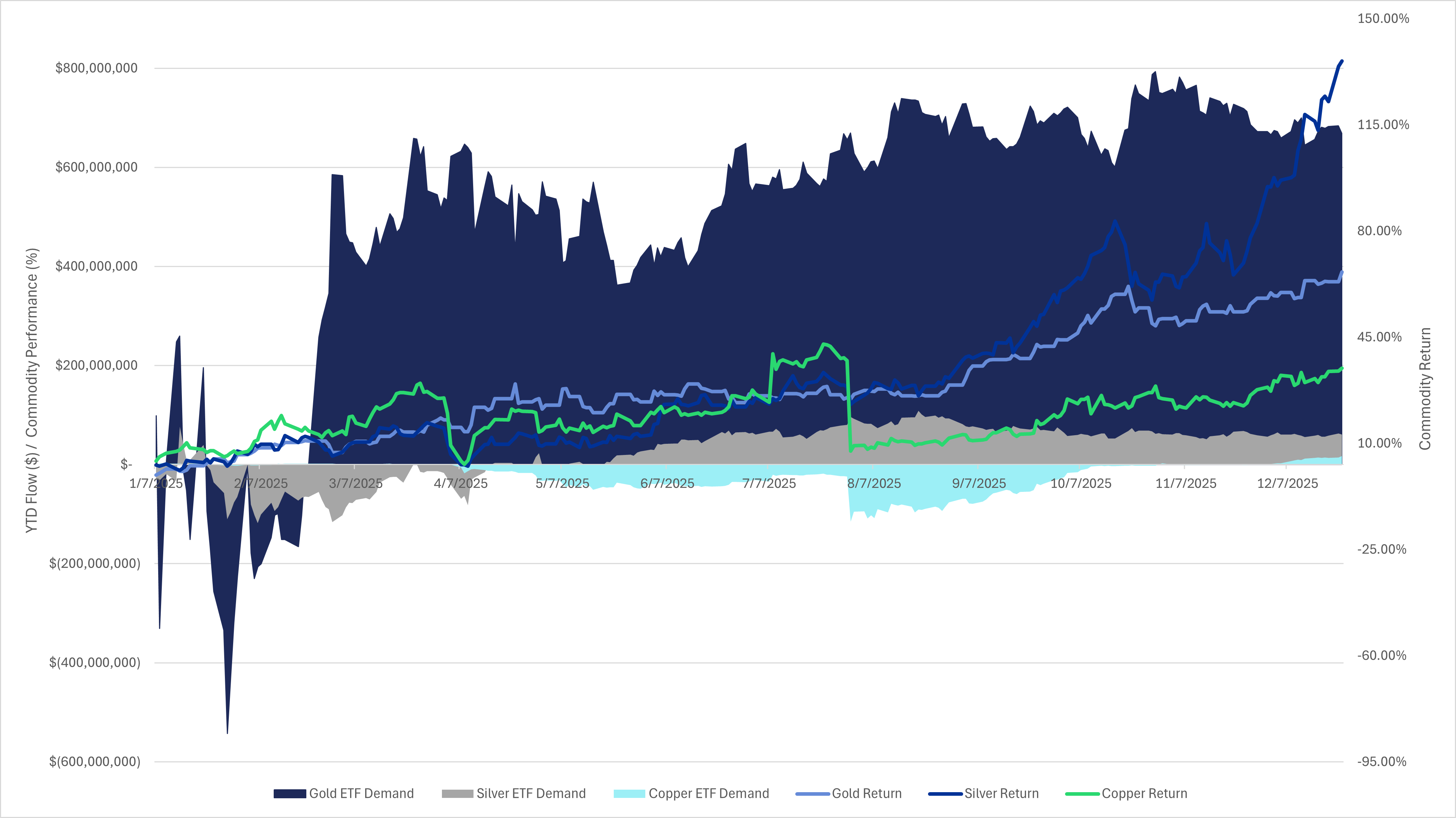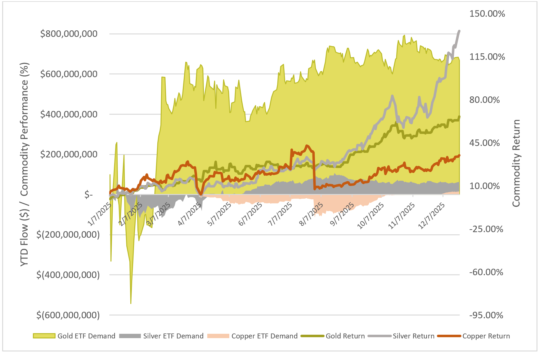 ETF issuers leaned into new gold and silver yield mandates in 2025, wasting little time in staking coverage. NEOS expanded into gold with the NEOS Gold High Income ETF (IAUI) while Roundhill added both Gold and Gold Miner strategies to its popular WeeklyPay shelf. Kurv initiated coverage on both precious metals with the Kurv Gold Enhanced Income ETF (KGLD) and Kurv Silver Enhanced Income ETF (KSLV) — the first option-writing ETF to focus exclusively on physical silver. Copper ETFs weathered a volatile year with 2025 ETF flows edging positive in December, and mining strategies like the Themes Copper Miners ETF (COPA) benefiting from sector tailwinds.