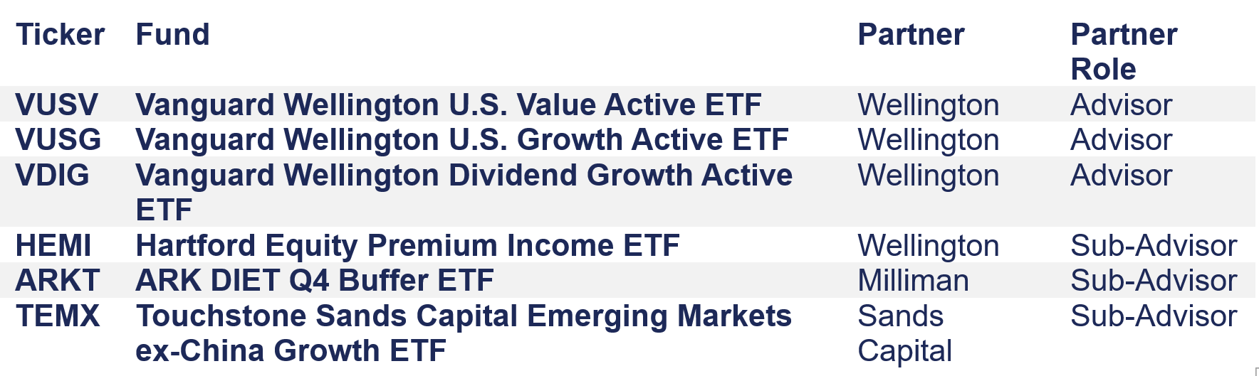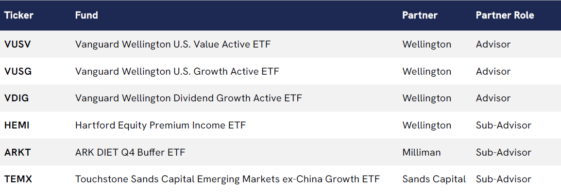 In 2025, the ETF space was marked by notable partnerships, as household investment management names combined ETF distribution prowess with institutional sub-advisory capabilities across the year’s biggest ETF launches on the Cboe BZX Exchange. Adding to its list of ETF accolades, JPMorgan Asset Management launched the JPMorgan Active High Yield ETF (JPHY), the industry’s largest active ETF launch ever. Through partnerships with Vanguard and Hartford, Wellington Management came to market in 2025 offering institutional strengths in active management and derivatives. Other notable sub-advisory arrangements in 2025 included derivatives ETF expert Milliman enabling ARK Invest’s debut tranche of buffered ETF products, as well as international specialist Sands Capital sub-advising ETF products manufactured by Touchstone.
