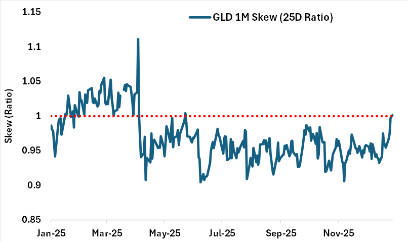 - Gold has been the biggest beneficiary of the geopolitical turmoil so far, up over 2% this morning. Interestingly, gold positioning had become a lot more defensive leading up to this weekend’s events, with GLD 1M skew steepening to the 80th percentile high on the back of increased demand for puts. For the first time since May, GLD puts are now trading at parity with calls (see chart below) suggesting traders see equal downside risk as upside potential for gold in the near-term. Longer term, investors are still bullish on gold, with GLD skew remaining inverted for tenors beyond 1M.