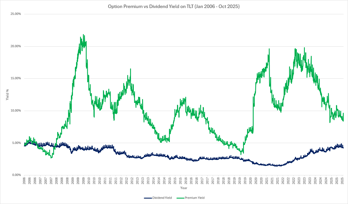 Figure 2: Dividend yields from TLT versus the yields generated through selling call options on TLT over the period from January 2006 to October 2025