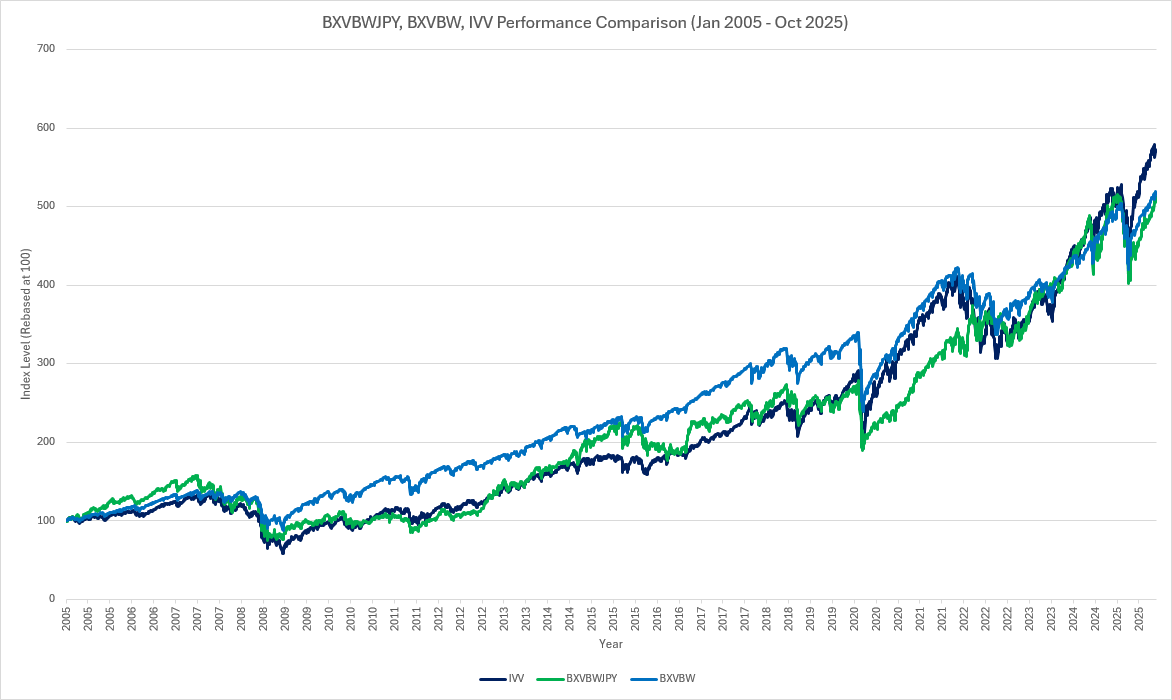 Figure 4: Performance of IVV and BXVBWJPY from January 2005 to October 2025 rebased at 100While a covered call strategy on the S&P 500 Index may underperform the index in a strong bull market, it can generate additional income that helps cushion losses if the market turns downward.