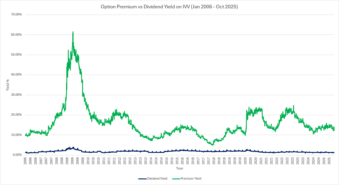 Figure 5: Dividend yields from IVV versus the yields generated through selling call options on IVV over the period from January 2006 to October 2025