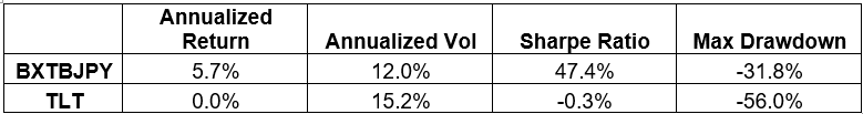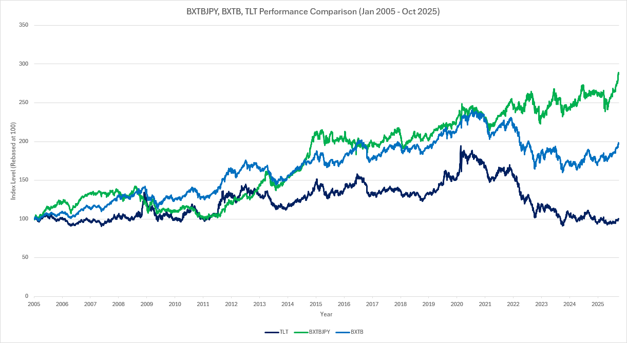 Figure 1: Performance of TLT and BXTBJPY from January 2005 to October 2025 rebased at 100