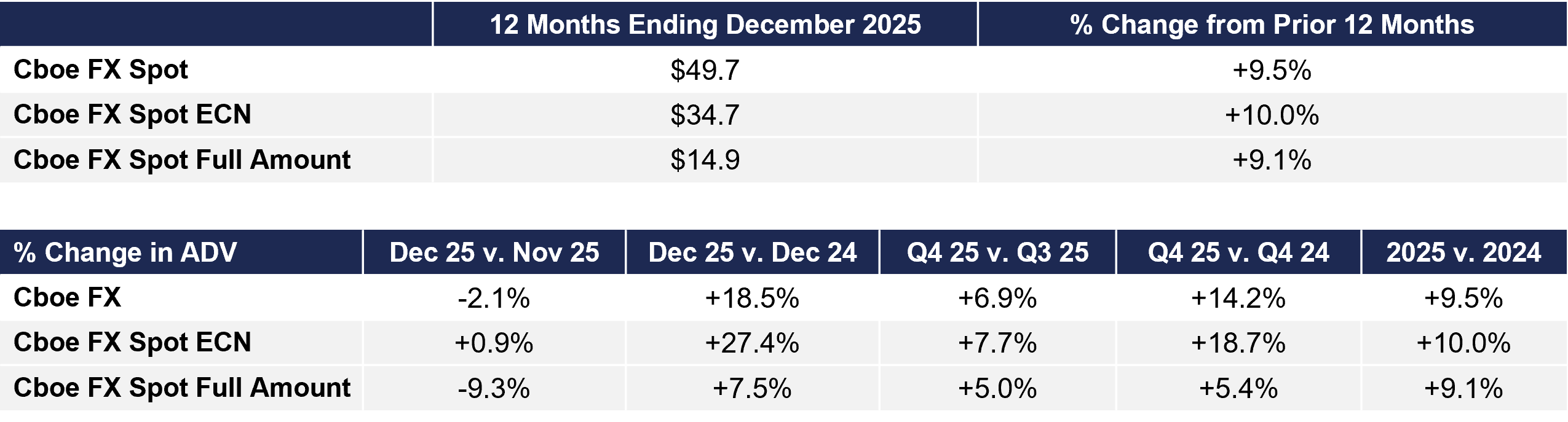 All Cboe FX statistics include data from both the NY5 and LD4 matching engines, unless otherwise indicated.
