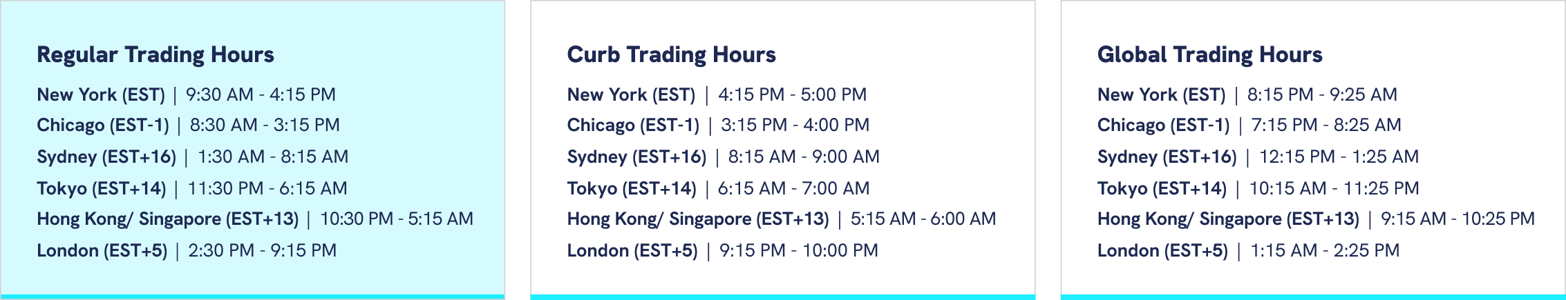 *Trading hours are determined by the time in Chicago. Note that Daylight Saving Time (DST) procedures vary by time zone and will affect the times shown here. For non-U.S. cities shown in this table, the trading hours may shift by one hour as the U.S. changes between Standard Time and Daylight Saving Time.