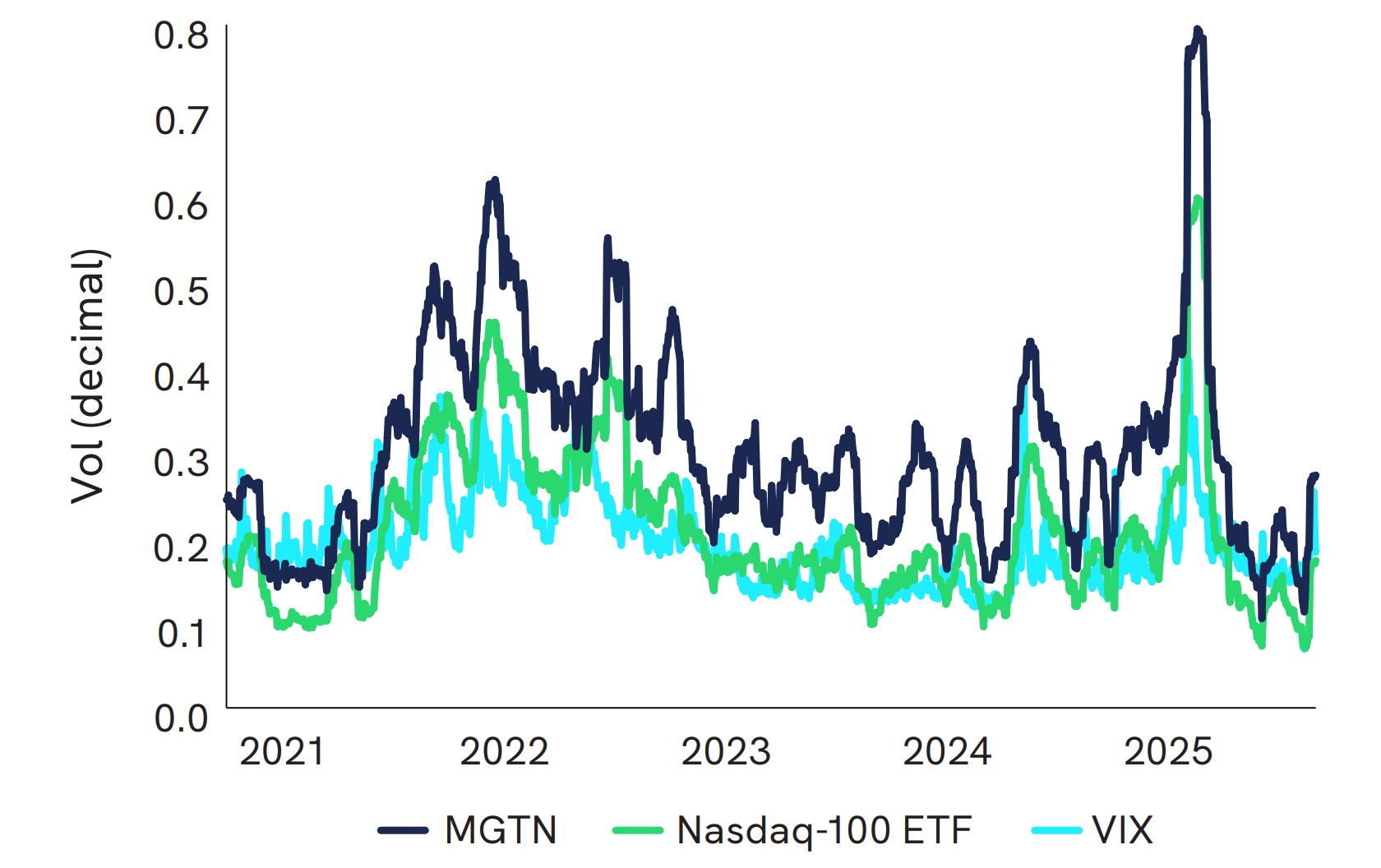 The MGTN Index consistently exhibits a high-beta, high-volatility profile relative to broader benchmarks. Rolling analysis between 2021 and 2025 showed betas of roughly 1.3-1.5 compared to QQQ, confirming its amplified sensitivity to market moves. Realized volatility fluctuated within a 25%-75% annualized range, occasionally spiking toward 70-80% during periods of market stress.