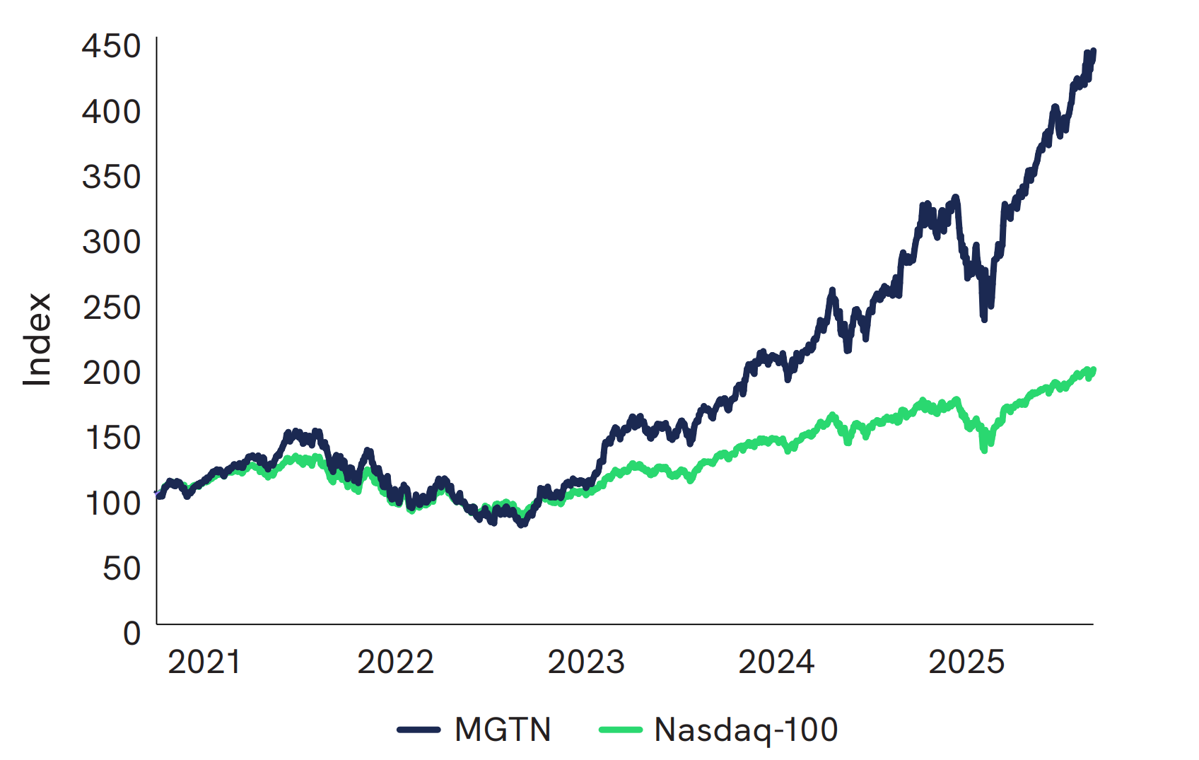 From 2021 to 2025, the MGTN Index delivered exceptional cumulative returns — rising nearly 300% and surpassing the Nasdaq-100, which was up 120% over the same period. This outperformance reflects the dominant earnings growth and valuation expansion of the stocks that comprise the index.