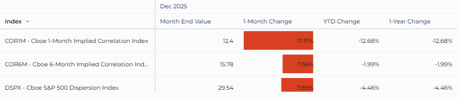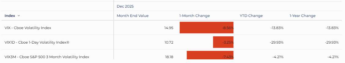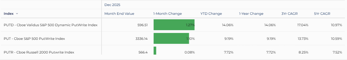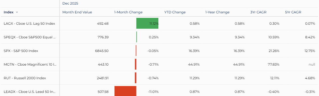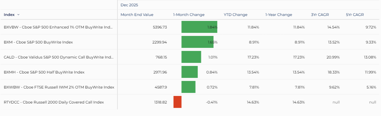 An early run to new highs at the start of December was offset by a mid-month slide of nearly 2.5% for the S&P 500® Index. That decline was followed by a rebound that left most equity indices with little change by month-end. Closing levels confirmed a decline of 3.5 points, or 0.05%, for the S&P 500 Index while the Russell 2000® Index slipped 0.74%. For the year, the S&P 500 Index gained more than 16%, while the Russell 2000 Index was up 11.29%. The Cboe U.S. Lag 50 Index (LAGX) increased 11.12% in December while the Cboe U.S. Lead 50 Index (LEADX) declined 11%, indicating that investors may have been trimming recent winners in favor of underperformers. The Cboe Magnificent 10 Index (MGTN) mirrored potential rebalancing of portfolios following very strong performance, with a decline of 0.71% and a year-to-date appreciation of nearly 45%. These dynamics combined with seasonal holiday factors dampened volatility. The Cboe Volatility Index (the VIX® Index) closed below 15, 1.4 points lower than November and one of the lowest levels of the year. Conditions favored premium selling indices with the Cboe S&P 500 Enhanced 1% OTM BuyWrite Index (BXBVW) up 1.84%, followed by the the Cboe S&P 500 BuyWrite Index (BXM) which gained 1.65%. Among indices writing puts, the Cboe Validus S&P 500 Dynamic PutWrite Index (PUTD) and Cboe S&P 500 PutWrite Index (PUT) indices both increased more than 1%. The crypto segment saw moderate stability following November's sharp decline, with the Cboe Bitcoin U.S. ETF Index (CBTX) down 3.5% to finish 2025 down 6.58%.