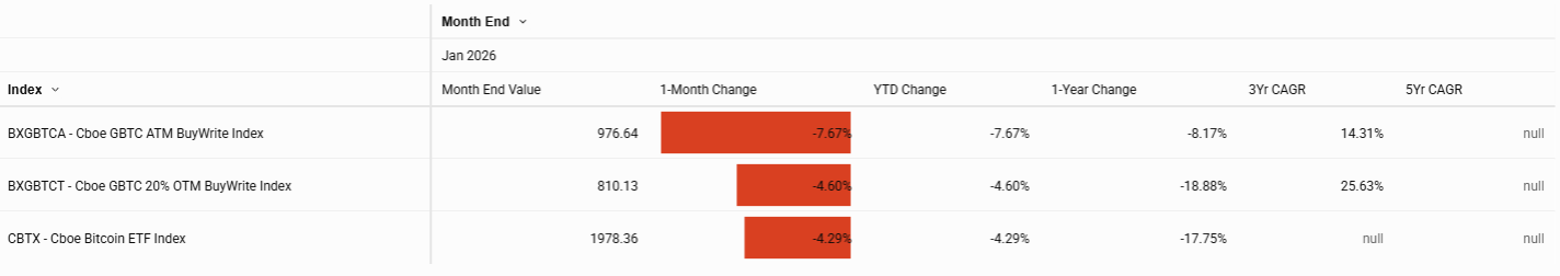 Weakness was evident in the crypto segment, with the Cboe Bitcoin U.S. ETF Indices (CBTX and MBTX) both down more than 4%.