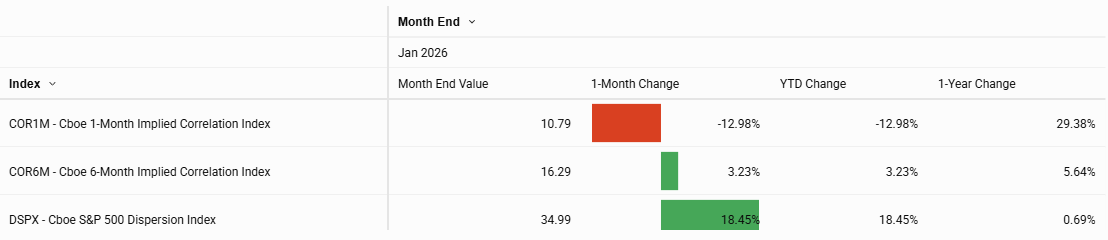 The Cboe S&P 500 Dispersion Index (DSPX) measures the expected dispersion in the S&P 500® over the next 30 calendar days, as calculated from the prices of S&P 500 index options and the prices of single stock options of selected S&P 500 constituents, using a modified version of the VIX® methodology. The Cboe S&P 500 Implied Correlation Indices including COR1M and COR6M are the first widely disseminated, market estimates of the average correlation of the stocks that comprise the S&P 500® Index (SPX). The Cboe S&P 500 Implied Correlation Indexes offers insight into the relative cost of SPX options compared to the price of options on individual stocks that comprise the S&P 500.