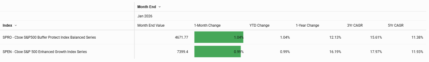 Fixed income indices saw moderate gains, led by the Cboe HYG BuyWrite Index (BXHB), up 0.78%, and the Cboe LQD BuyWrite Index (BXLB), up 0.5%. Target outcome indices — the Cboe S&P 500 Enhanced Growth Index Series (SPEN) and the Cboe S&P 500 Buffer Protect Index Series (SPRO) — also posted gains near 1%.