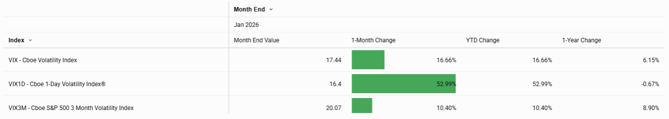 Following a relatively quiet holiday period, implied volatility finished the month well above muted year‑end levels, with the Cboe Volatility Index ® (VIX) closing at 17.44, 2.5 points higher month-over-month.