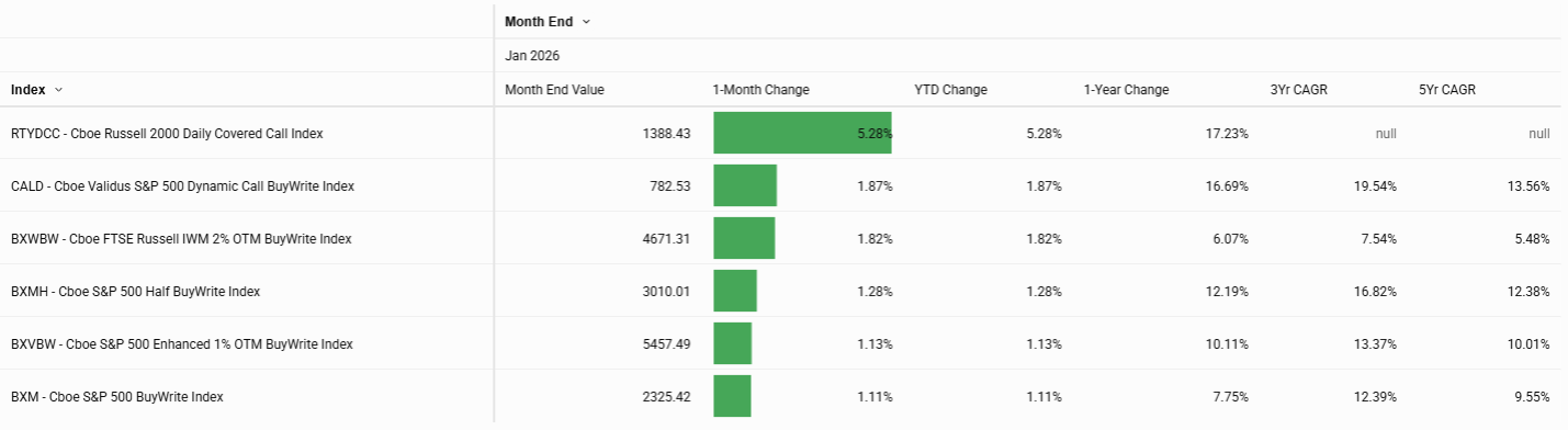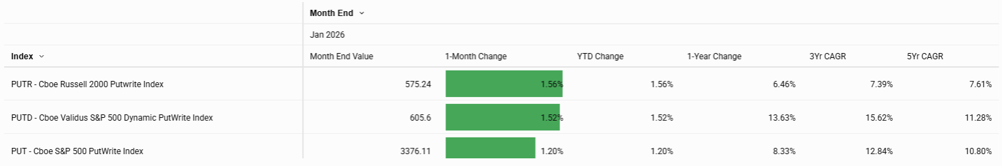 Among indices featuring call‑writing, higher premiums combined with mixed underlying moves led to gains for most indices, including the Russell 2000 Daily Covered Call Index, which was up 5.28%, and the Cboe Validus S&P 500 Dynamic Call BuyWrite Index (CALD), which rose 1.87%. Put‑writing indices were also higher on the month, with both PUTR and PUTD gaining nearly 1.5%.
