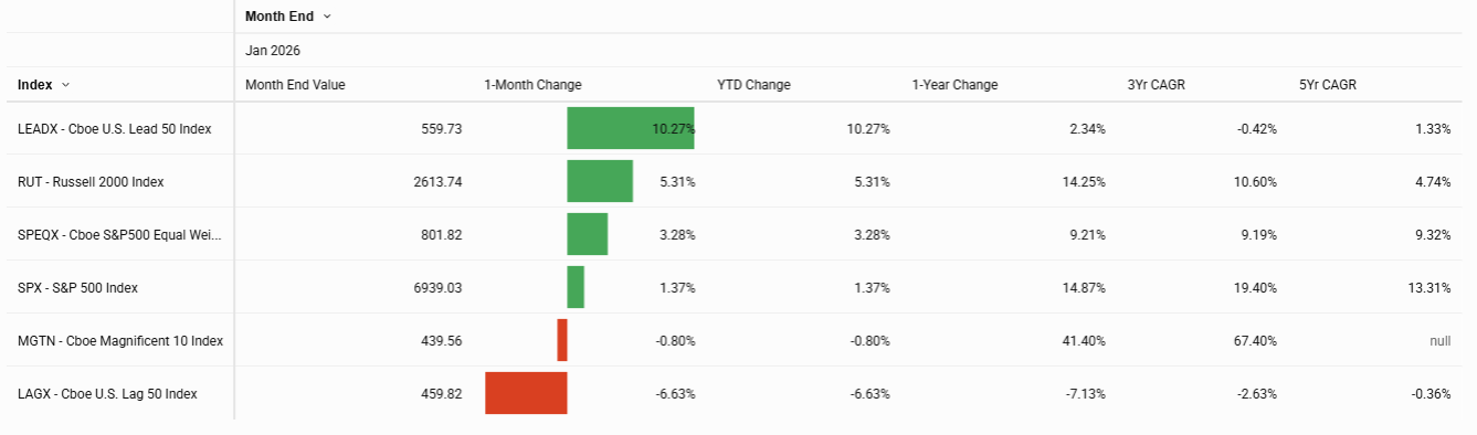 Illustrating the shift, the Cboe Magnificent 10 (MGTN) Index declined 0.8%, while the Cboe U.S. Lead 50 Index (LEADX) — highlighting performance of the 50 top performers — gained nearly 10.3%. In contrast, the Cboe U.S. Lag 50 Index (LAGX), comprised of the worst‑performing stocks, fell 6.6%.