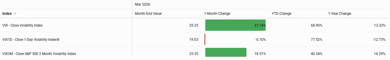 Volatility increased alongside the drawdown. The Cboe Volatility Index (VIX® Index) climbed roughly six points, finishing near 25 and breaching 30 multiple times during the month, reflecting elevated demand for convexity and rising cross-market correlations.