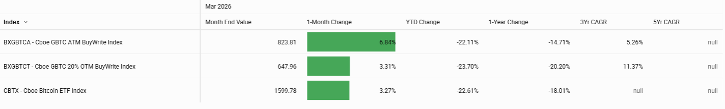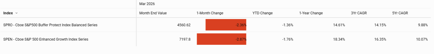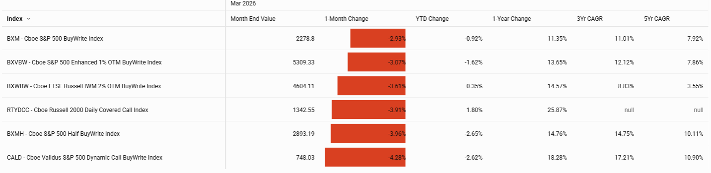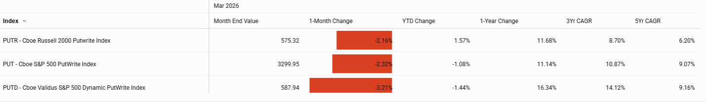Elevated option premiums helped cushion losses for income-oriented strategies. The Cboe S&P 500 PutWrite Index (PUTD) declined 3.2%, while the Cboe S&P 500 One-Month Covered Call Index (CALD) fell 4.3%, both outperforming the underlying equity benchmark as higher volatility provided meaningful premium income to partially offset spot declines.