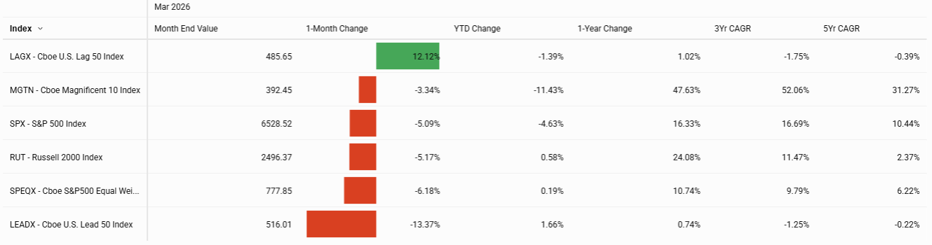 March marked a sharp risk-off turn across U.S. equities, as selling pressure broadened and volatility increased sharply. Unlike February’s rotational dynamics, losses were widespread across market cap segments and index constructions.