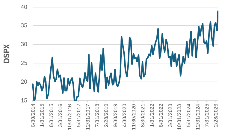 - Our VIX decomposition analysis (Exhibit 2) showed that the “spot up, vol up” dynamic was driven by a combination of higher fixed strike vols and long risk reversal positioning (i.e., investors selling upside calls to fund downside protection). This positioning has steepened skew from 7th percentile lows last week to 60th percentile levels.