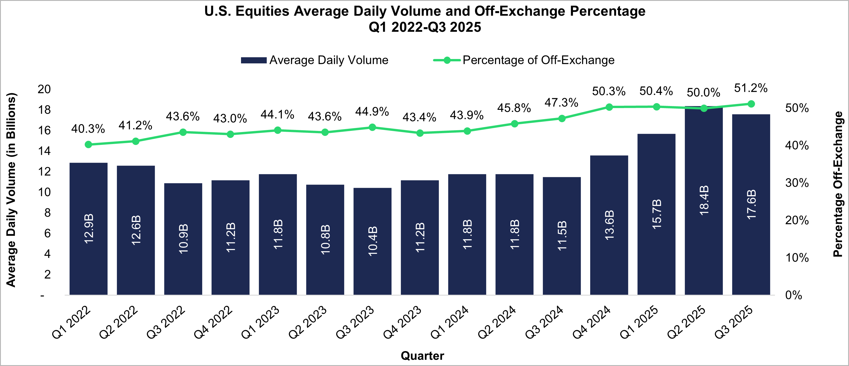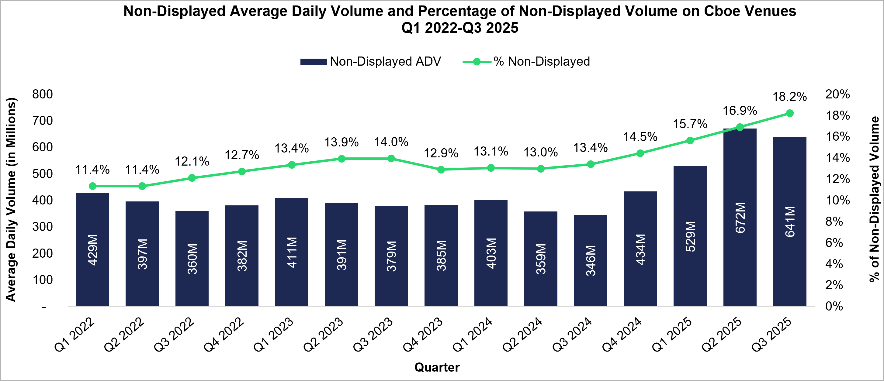 The U.S. equities market has experienced substantial growth in 2025, with Average Daily Volume (ADV) reaching 17.6 billion shares in the third quarter, a 53% year-over-year increase. Following this volume growth, the percentage of off-exchange trading increased to over 50% during the third quarter of 2025, up 8.26% year-over-year. This increase continues a multi-year trend that emphasizes growing interest in dark, or non-displayed execution. Cboe's equities exchanges offer traders the ability to minimize market impact and improve performance through the use of dark orders. Cboe has observed growth in on-exchange non-displayed volumes alongside off-exchange growth, as clients seek both the benefits of dark execution — price improvement, reduced market impact and anonymity, combined with the resiliency and oversight of trading on exchange.