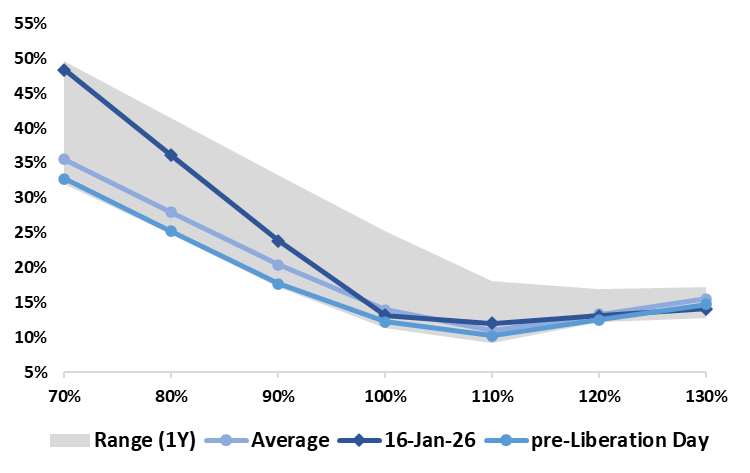 - Although the unexpectedness of last week’s geopolitical/ trade tensions initially sparked fears of a Liberation Day style market fallout, global equity volatility markets showed much more resilience this time around with the VIX® Index, VSTOXX and the VVIX Index rising roughly 20% of their respective Liberation Day increases before closing the week’s session only marginally higher across all three benchmarks. A large part of the reason why the equity volatility markets were so well controlled was due to the defensive positioning of traders heading into the event. As shown in the exhibit below, S&P skew heading into last week’s Greenland announcement was (and still remains) at a 98th percentile high, indicating an elevated level of downside hedging.