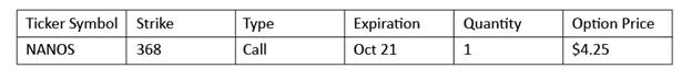 Suppose Nanos are trading at $370, and you want to purchase a 368 call option expiring on October 21.