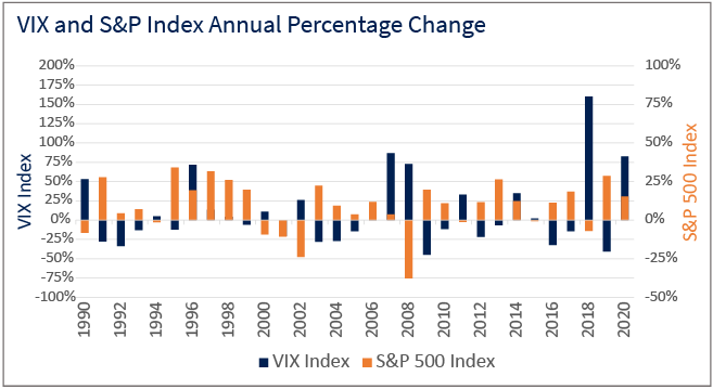 Generally, the VIX Index tends to have an inverse relationship with the S&P 500 Index. Expected volatility typically increases when markets are turbulent. In contrast, if stock prices are rising the VIX Index generally tends to fall or remain steady. But as you can see, this may not always hold true.
