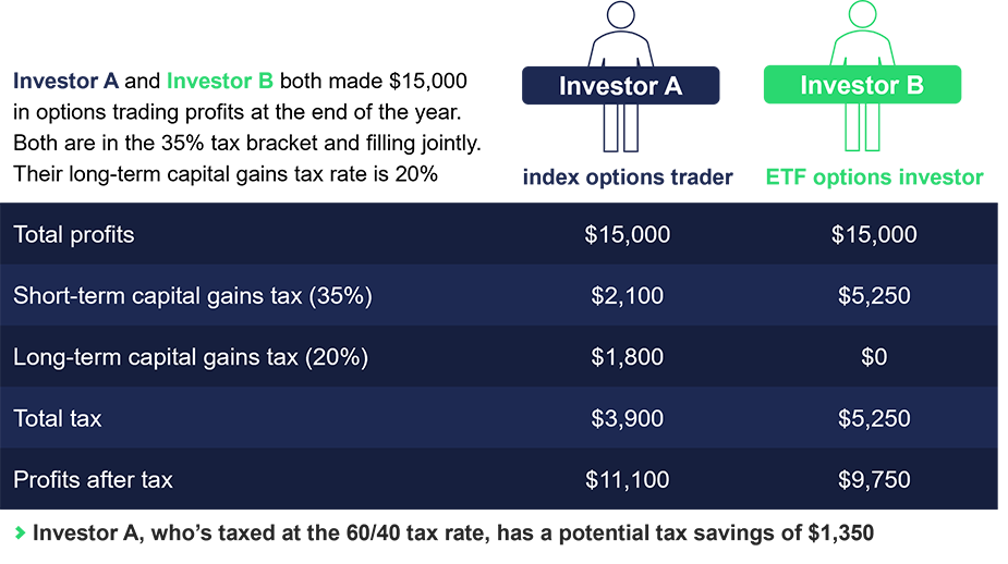 Take, for example, an investor in the 35% tax bracket who had $15,000 in taxable trading profits. If they were trading ETF options, they could be taxed at the ordinary income rate and pay as much as $5,250 in taxes. If, on the other hand, the investor was trading index options that qualified for 60%/40% tax treatment, they would only pay $3,900. That's a difference of $1,350. Ask your accountant about the tax implications of trading ETF options versus index options.